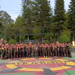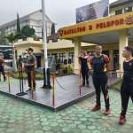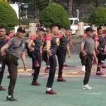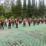 Kab Bandung-Cikole, Prajurit TNI bersama personel Polri melaksanakan senam bersama di Markas Brimob Detasemen Kompi B, Cikole Lembang, Kab Bandung.  Anggota TNI Polri tersebut terdiri dari kesatuan Dodik Bela Negara dan kesatuan Brimbo Detasemen Kompi B.